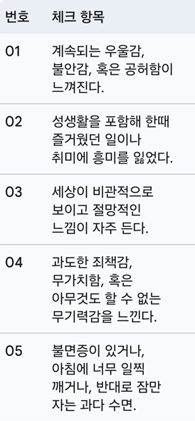 [표] 여성 갱년기 우울증 자가진단 체크리스트